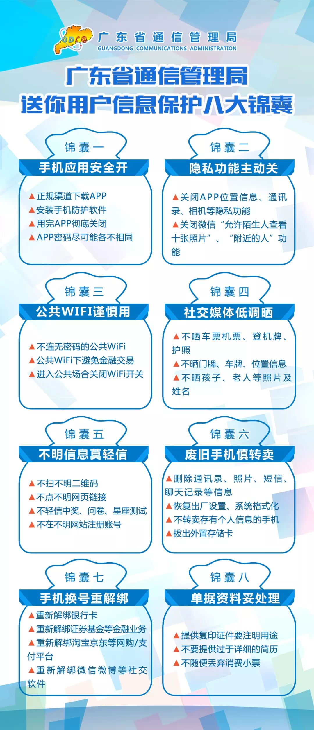 孩子一出生,家里的电话就会被月嫂公司打爆;手里缺钱,贷款公司就赶着送来“及时雨”;准备深造,培训信息简直要把手机刷屏...互联网时代,大家都会有上面这些经历。3.15即将来临之际,为保障广大电信和互联网用户的合法权益,广东省通信管理局送你用户信息保护八大锦囊,让个人信息和隐私数据不再“裸奔”。